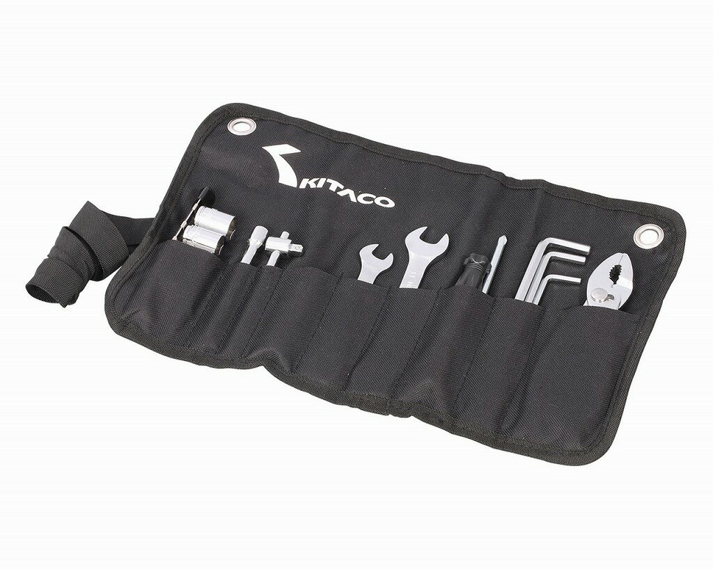 バイク用アフターパーツメーカーのキタコ製。出先のちょっとした整備から日常のメンテナンスまで使える、コンパクトな工具セット。ラチェットハンドルやソケット(8〜14mm)、両口スパナ、プライヤー、六角レンチ、差し替えドライバーなど基本ツールが揃っていて、携帯性抜群。バイクや自転車のお供にピッタリです。